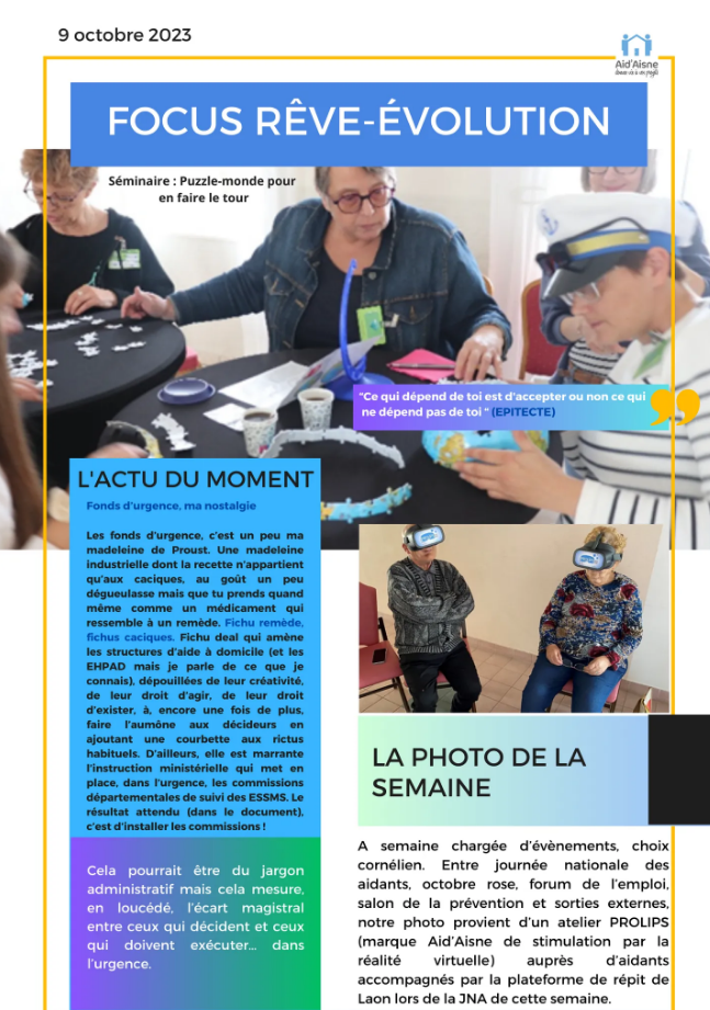 Le focus de cette semaine évoque l’atelier PROLIPS, moment de stimulation par la réalité virtuelle proposé aux aidants en coordination avec la plateforme de répit de Laon… Et un petit retour sur notre séminaire des Fonctions Ressources du 28 octobre dernier…