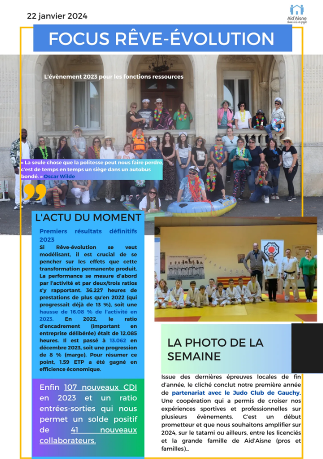 Outre Oscar Wilde qui nous évoque la politesse à sa façon, nous commençons à observer quelques données définitives de l’année 2023, comme celle de la hausse d’activité supérieure à 16 % mais aussi comme le solde entre arrivées et départs des collaborateurs de la communauté Aid’Aisne : + 41 salariés opérationnels de terrain🥰…