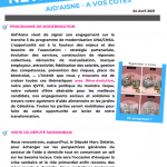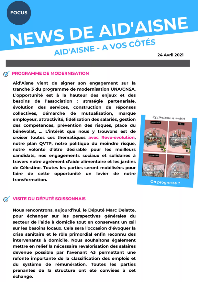 Dans les News de la quinzaine, on y retrouve l’engagement de l’association dans le cadre de la Modernisation UNA/CNSA… avec une volonté de mobiliser le maximum en interne sur les sujets de subsidiarité.. et la visite du Député vendredi après-midi pour nous évoquer l’avenant 43 mais également la nécessité de mieux coordonner les besoins de l’hôpital avec les SAAD…