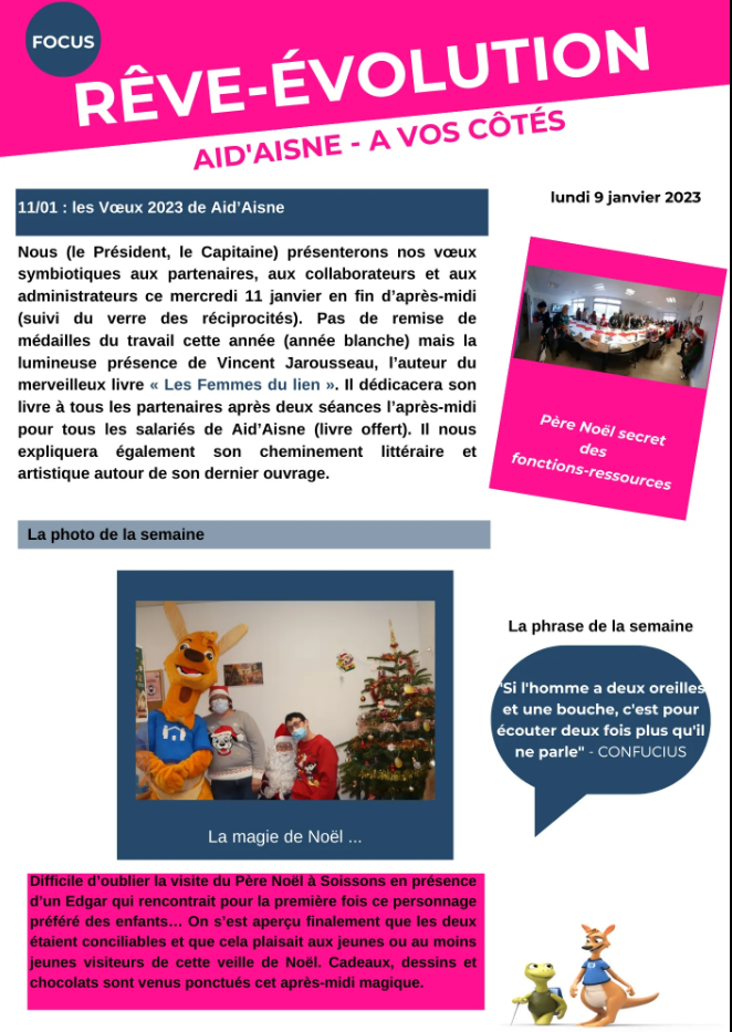 Premier FOCUS de l’Année 2023… Le premier grand rendez-vous a lieu cette semaine avec les vœux de Aid’Aisne et la présence de Vincent Jarousseau 😀 célébrant les femmes du lien… Ce 11 Janvier, dès 14 heures, sera réservé aux professionnels de Aid’Aisne : dédicace de l’écrivain et livre offert par la structure.