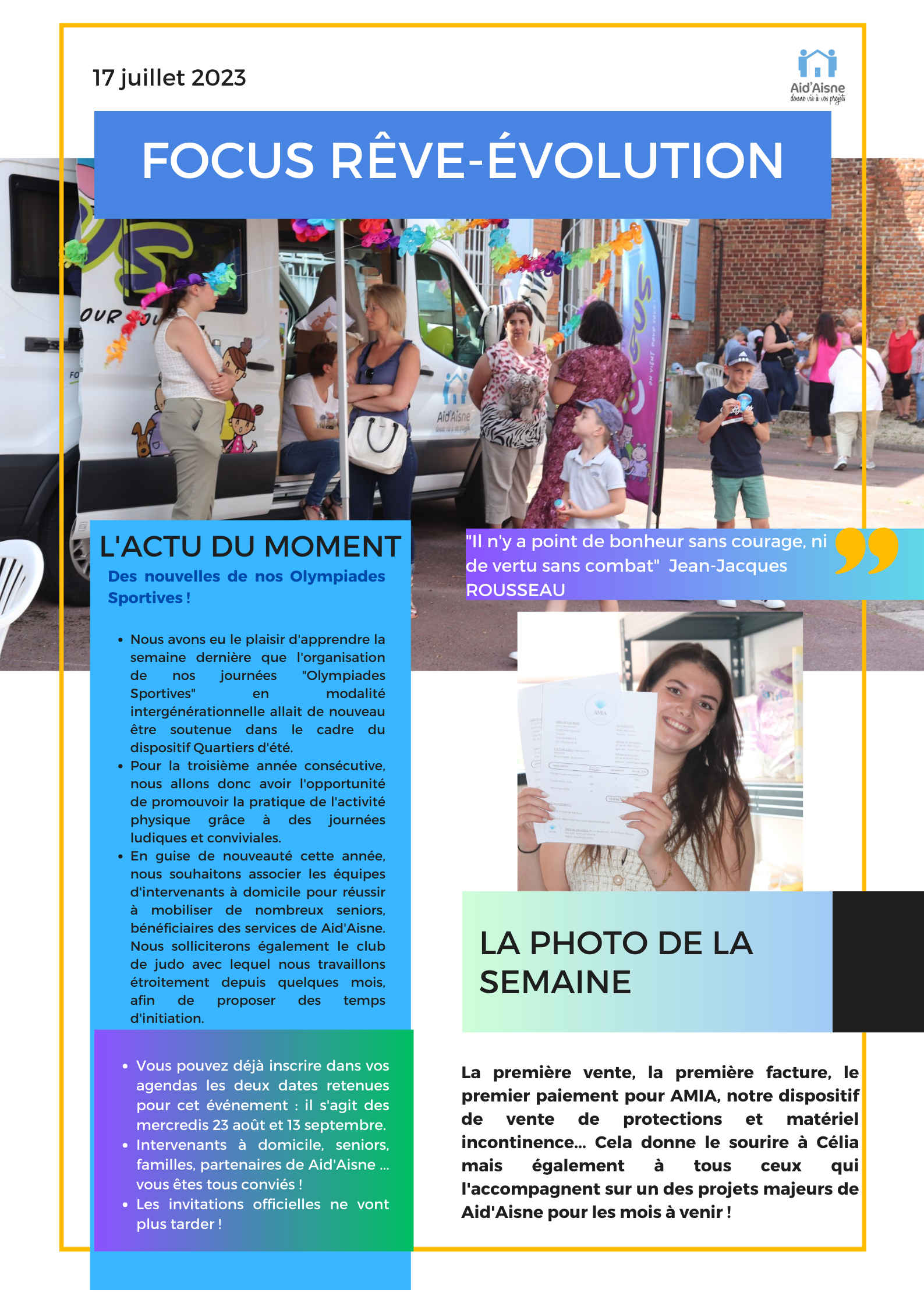 Le focus de cette semaine évoque le renouvellement de l’organisation de nos journées « Olympiades Sportives », dates retenues : les 23 août et 13 septembre 2023.