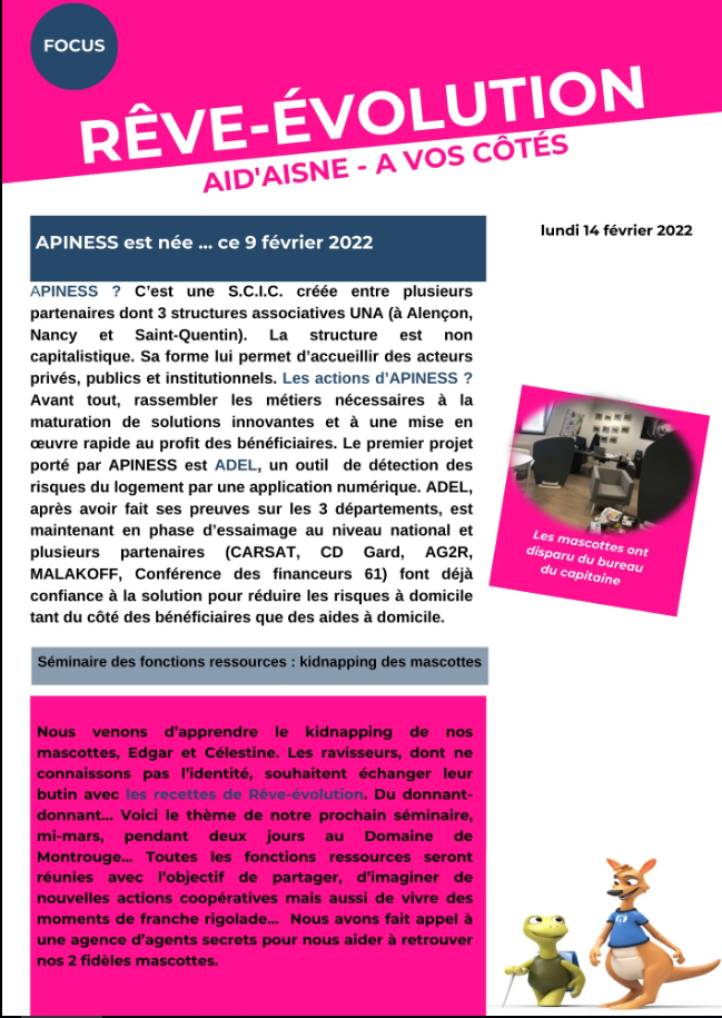 Cette semaine dans le Focus, la création de APINESS, une SCIC créée entre plusieurs partenaires pour des projets innovants dans le monde de l’économie sociale et solidaire qui débute par une première action, nommée « ADEL », la solution de détection des risques du logement…