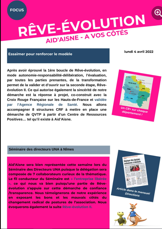 Cette semaine dans le focus, c’est riche… en 1er lieu, on y évoque l’essaimage du Centre de ressources positives de Rêve-évolution à travers l’appel à projet #ARS des Hauts de France sur la #qvt et, bien sûr, prochainement, le séminaire des directeurs UNA… où Aid’Aisne présentera sa démarche à côté de celle d’Alençon (l’un enrichit l’autre et vice versa)… et bien sûr, exposera un stand pour la SCIC APINESS…
